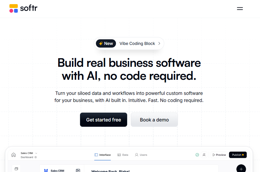Softr is a strong fit when you want data-connected portals and internal tools on top of tools like Airtable and Google Sheets. It is not the best option if you prefer building primarily through AI prompts instead of a drag-and-drop visual editor.