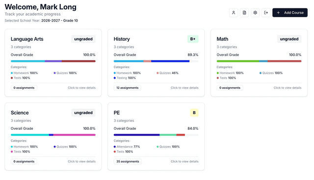 Wanting to see the scores you have in your classes in real time? Use this grade tracker to see your current grade at any time and print mock-up Report Cards with your GPA.