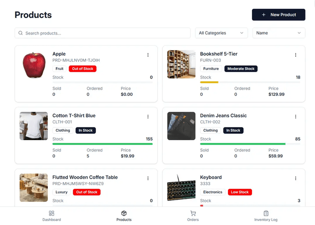 A modern inventory management app for tracking products, stock levels, and orders in real time. Includes a dashboard for quick insights, product catalog management, purchase and sales order tracking, and a detailed inventory log with movement filters. Keep your operations organized, spot low stock instantly, and manage suppliers and customers with ease.