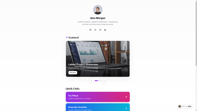 A minimal, aesthetic link-in-bio page designed for creators who want a clean and elevated online presence. Add your links, socials, offers,favorite tools, and brand colors all in a polished layout.