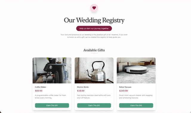 A modern, elegant wedding registry where couples can curate and share their favorite gifts. Add images, manage contributions, and create a beautiful experience for guests to celebrate your special day.